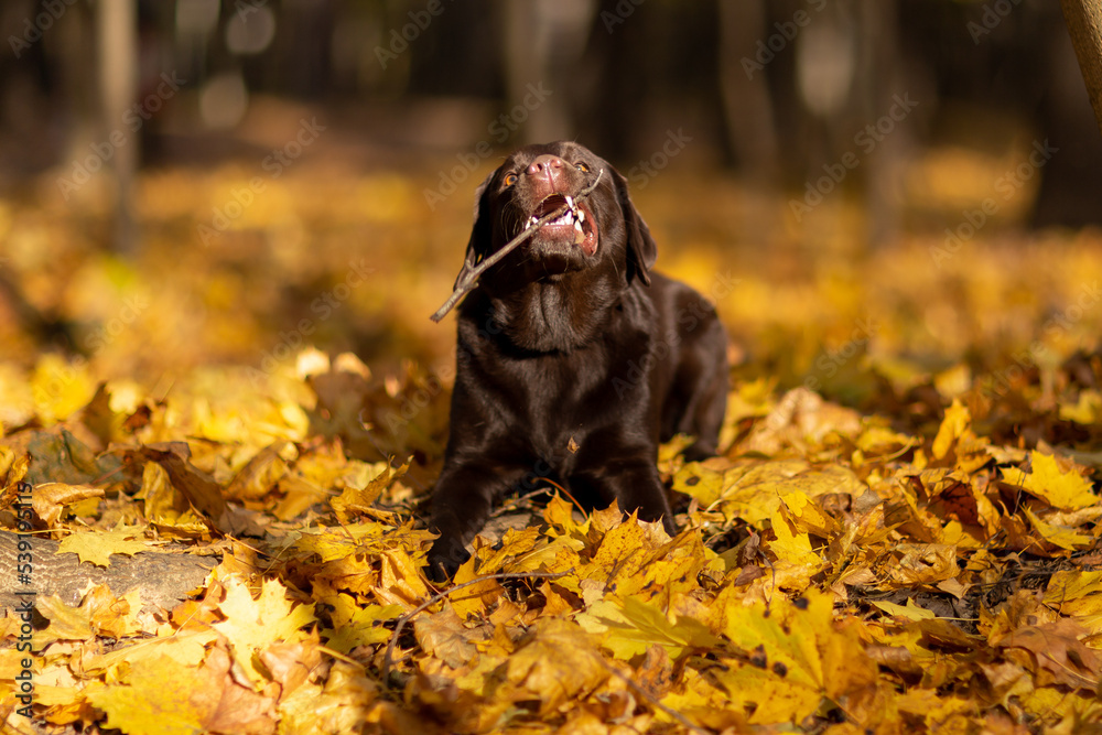 a young Labrador retriever dog of chocolate color lies on golden foliage in the park in autumn playing with a stick in its mouth