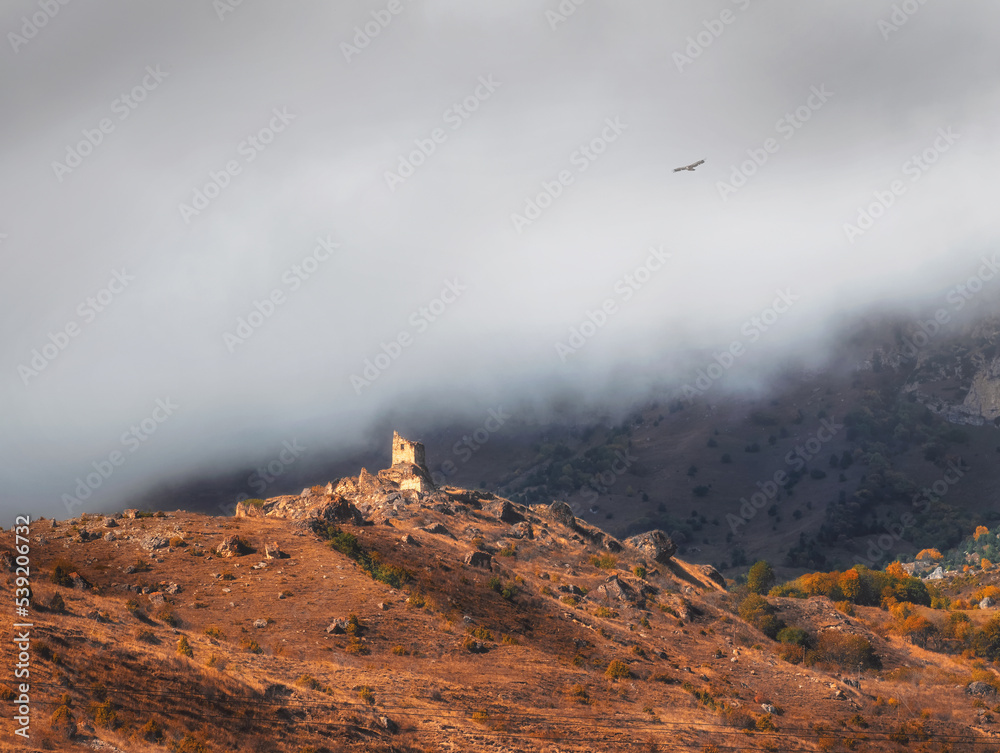 Beautiful dramatic landscape nature view in the mountains. Old Ossetian battle tower in the misty mountains. Digoria region. North Ossetia, Russia.