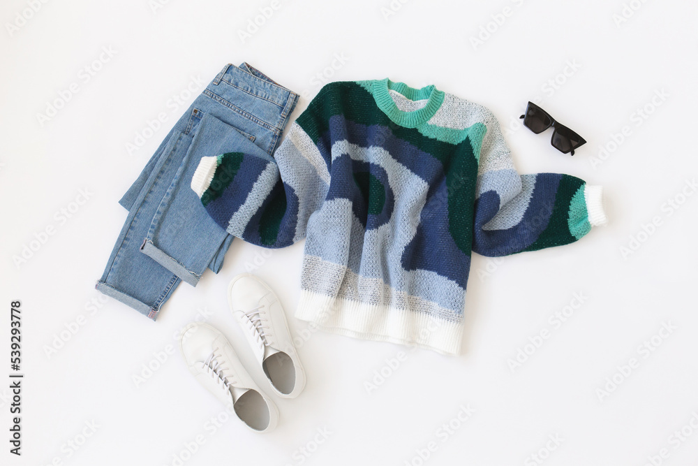 Blue jeans, blue knitted sweater, white sneakers and sunglasses lying on white background. Overhead view of women's casual outfit. Trendy stylish women clothes. Flat lay, top view.