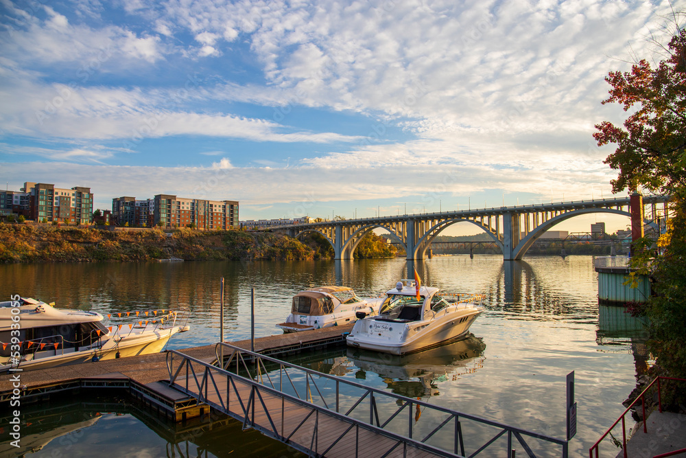 a gorgeous autumn landscape along the Tennessee River with boats docked and the Henley Street Bridge over the water with blue sky and clouds at sunset in Knoxville Tennessee USA