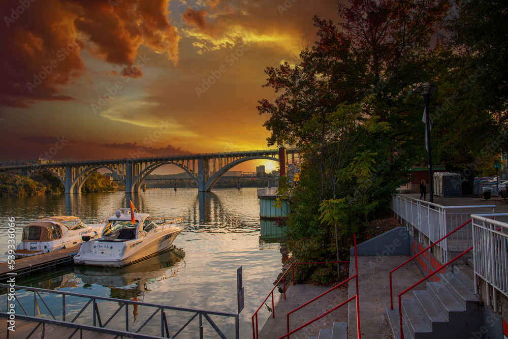 a gorgeous autumn landscape along the Tennessee River with boats docked and the Henley Street Bridge over the water with red sky and clouds at sunset in Knoxville Tennessee USA