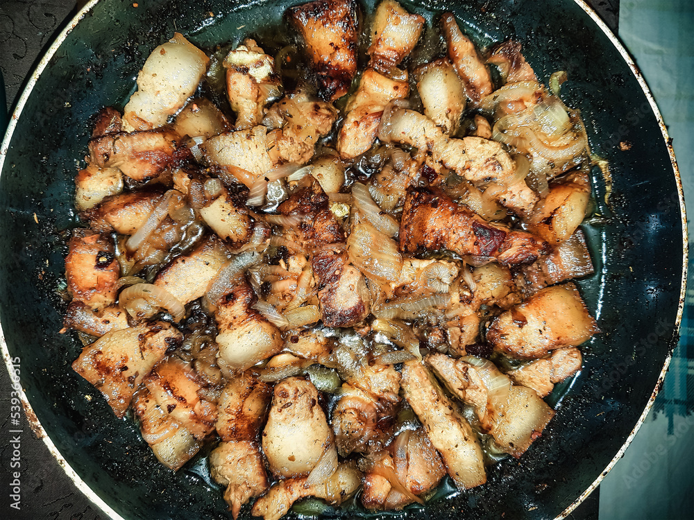 Grilled pork meat in a skillet fortified plans. View from above. Cooking meat.