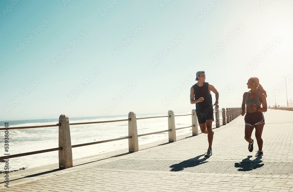 Fitness, couple and running for exercise by beach in workout, training and cardio in South Africa outdoors. Active man and woman in sports run by the ocean in sea point for healthy exercising outside