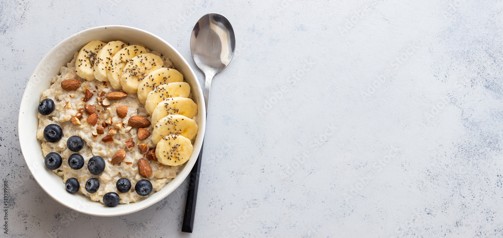 Oatmeal with banana, blueberries, almonds and honey. Healthy food. Vegetarian food. Breakfast.