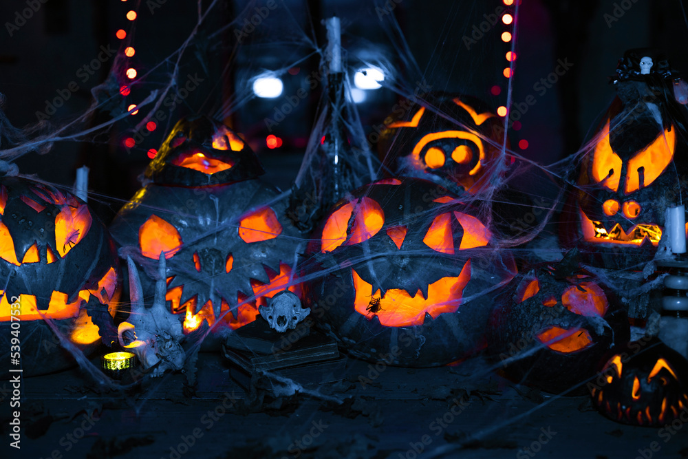 Moonlight Jack 'O' Lanterns from Carved Pumpkins Background close up