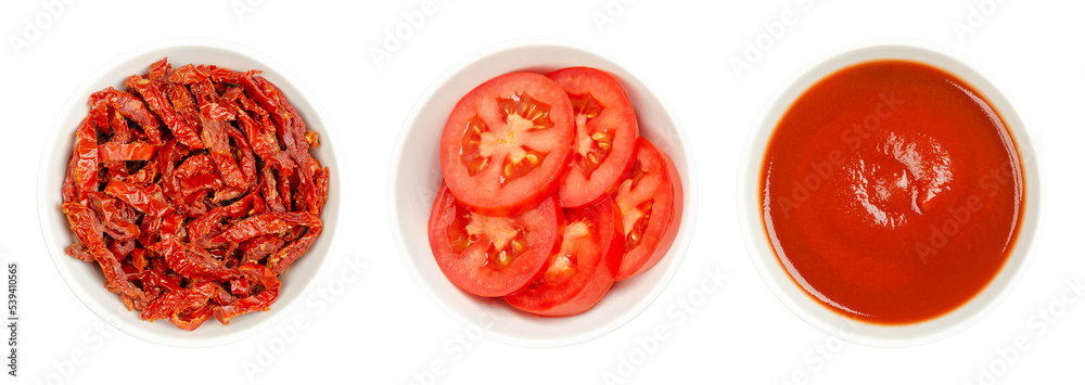 Fresh and sun-dried tomato slices, and tomato puree, in white bowls, isolated, from above.Pile of sliced, red and ripe plum tomatoes, Julienne strips of sun-dried tomatoes, and canned passed tomatoes.