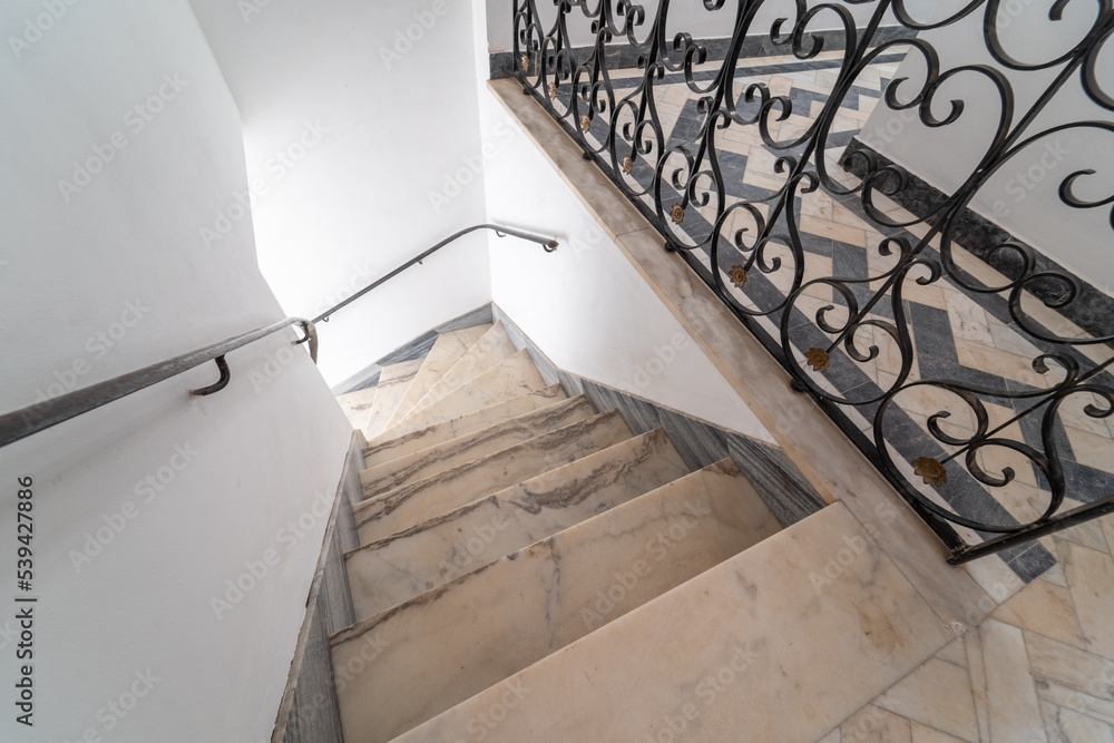 Contemporary stairway. Interior house stairs. Staircase going down. Pathway of stairway or staircase inside a house. Interior structure design concept..