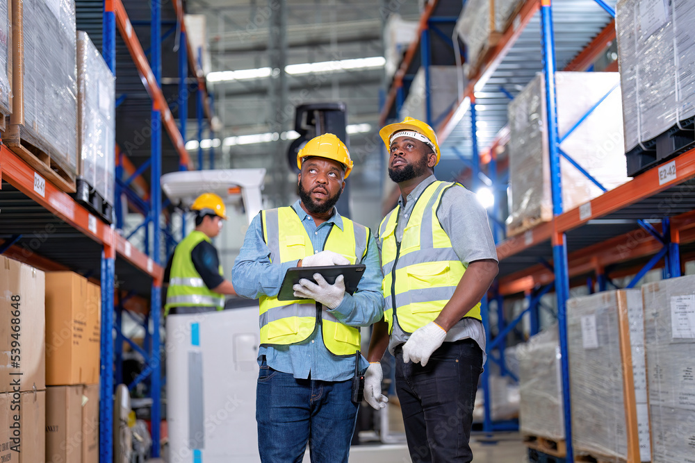 African american working in warehouse hold tablet check list perform inventory stock check at the storage steel racking pallet truck loading carton box near by