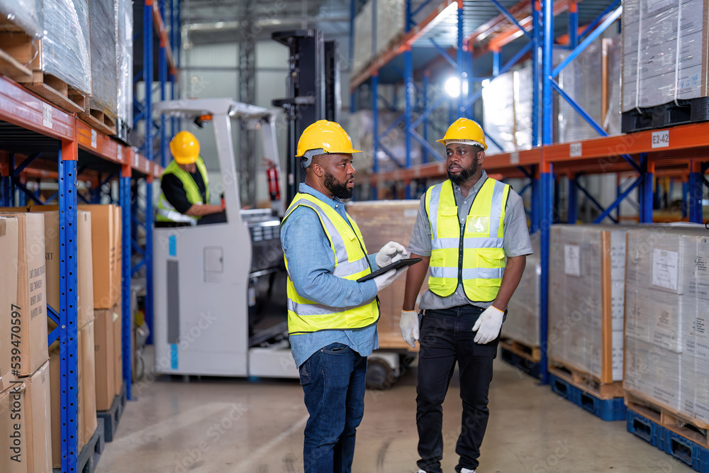 African american working in warehouse hold tablet check list perform inventory stock check at the storage steel racking pallet truck loading carton box near by