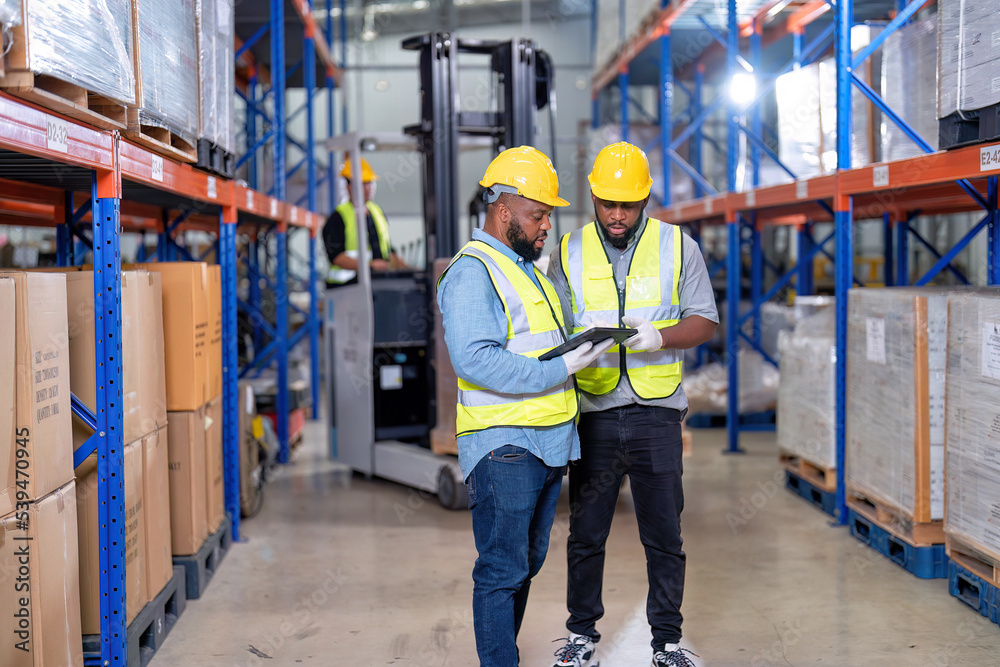 African american working in warehouse hold tablet check list perform inventory stock check at the storage steel racking pallet truck loading carton box near by