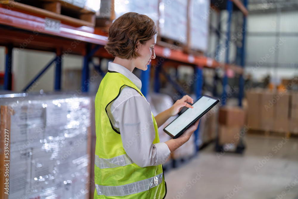 Worker in warehouse hold tablet check list perform inventory stock check goods boxes on the storage steel racking for annual report