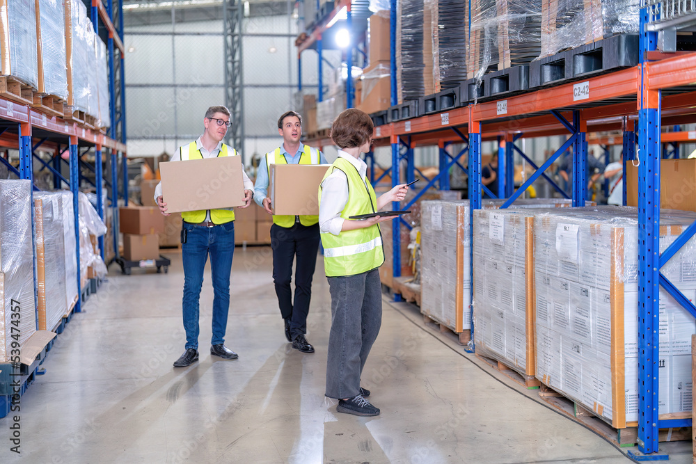 Warehouse worker hold the carton box walk along the steel racking shelf looking for storage area on the correct location ready for barcode scan