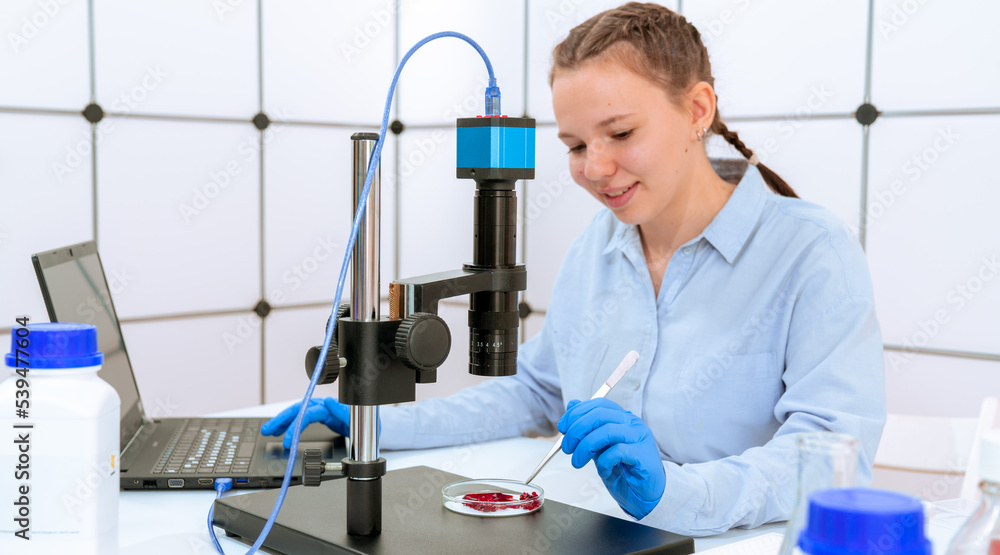 young woman scientist in crystallography laboratory studying crystals under electron microscope