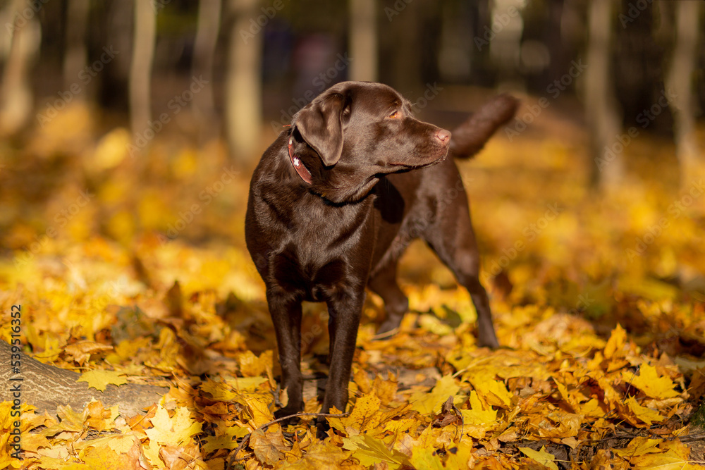 a beautiful young statuesque Labrador retriever dog of chocolate color stands proudly on a sunny autumn day on yellow foliage on a walk in the park