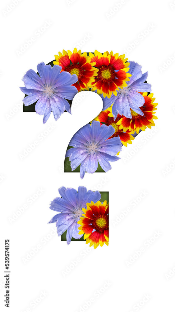 Paper cut-out question mark filled with blue and yellow-red summer flowers