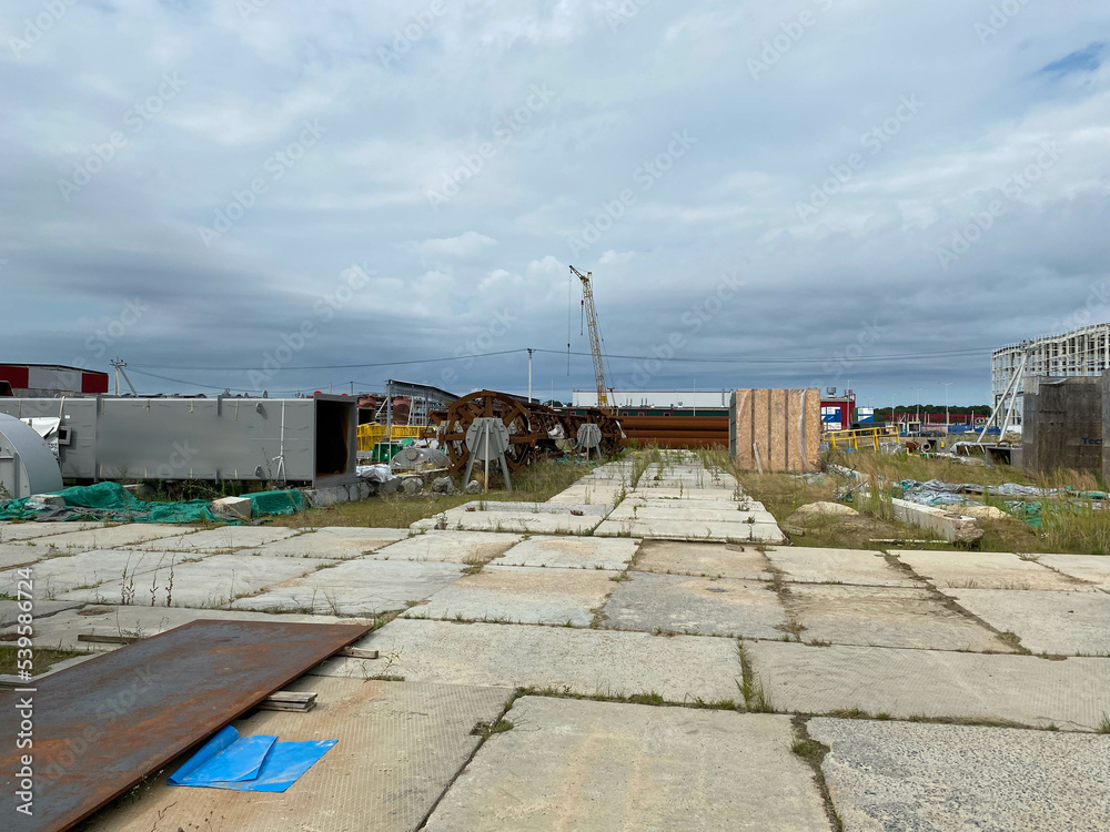 A large outdoor warehouse at a construction site, a warehouse for industrial equipment and materials in boxes at an open-air storage site