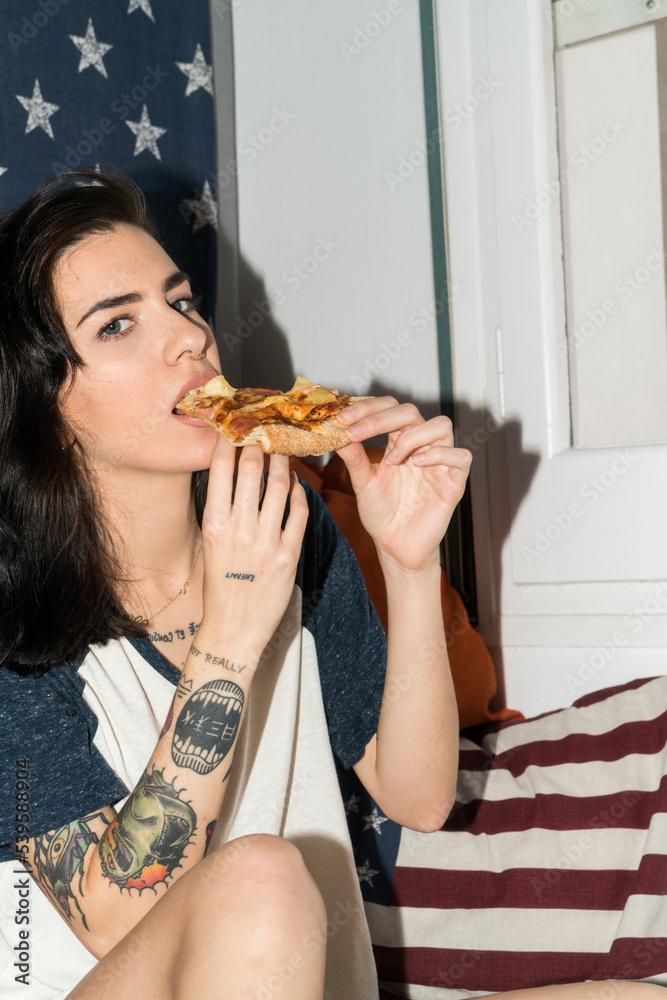 Young woman with tattoos having pizza in bed with a united states flag.