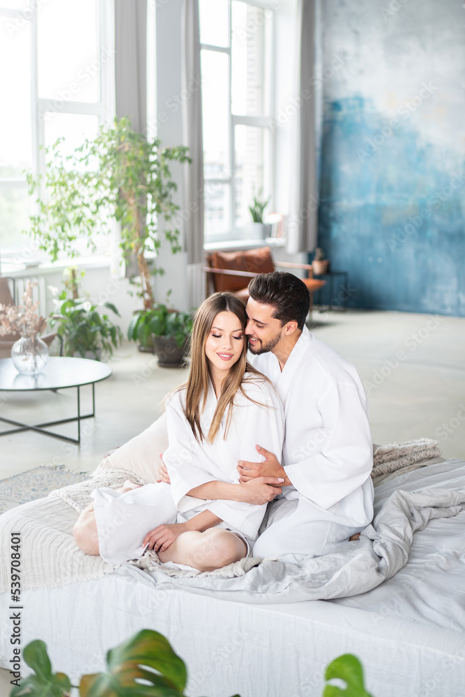 Romantic young couple spending morning together at home. Two beautiful people enjoying valentines day. Relax. Date. Love.