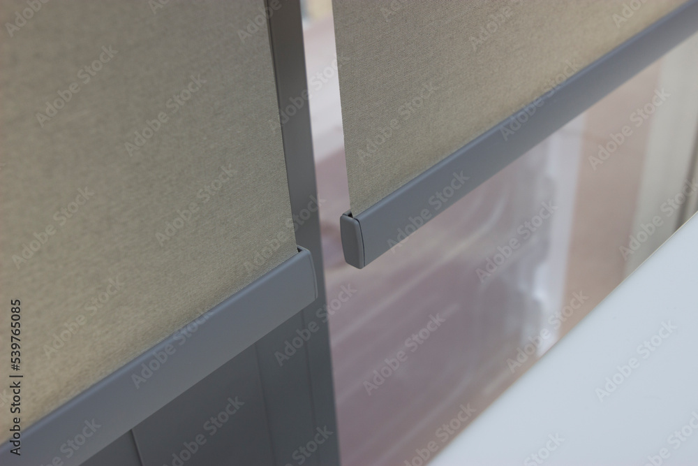 Roller blinds on the window closeup, sand-colored material, silver bottom rail. The distance between the fabrics when installing roller shades end-to-end. Selective fokus. Motorized curtains.