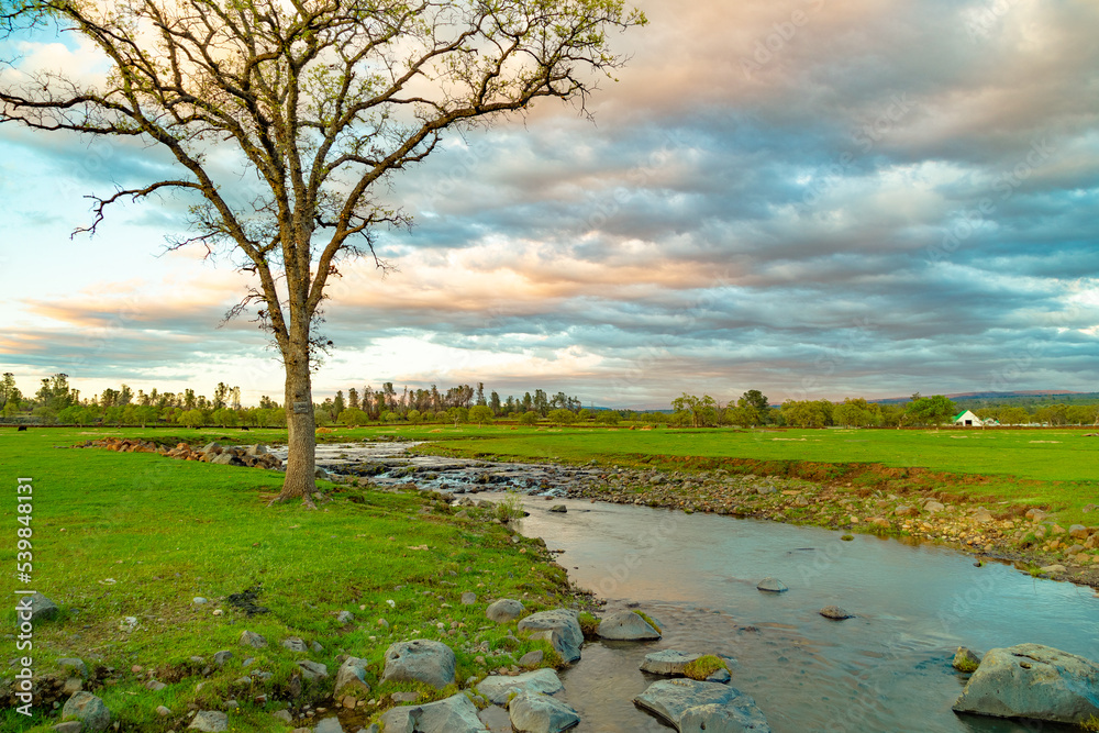 Spring Green Oak Trees with green grass and a stream on a cloudy day