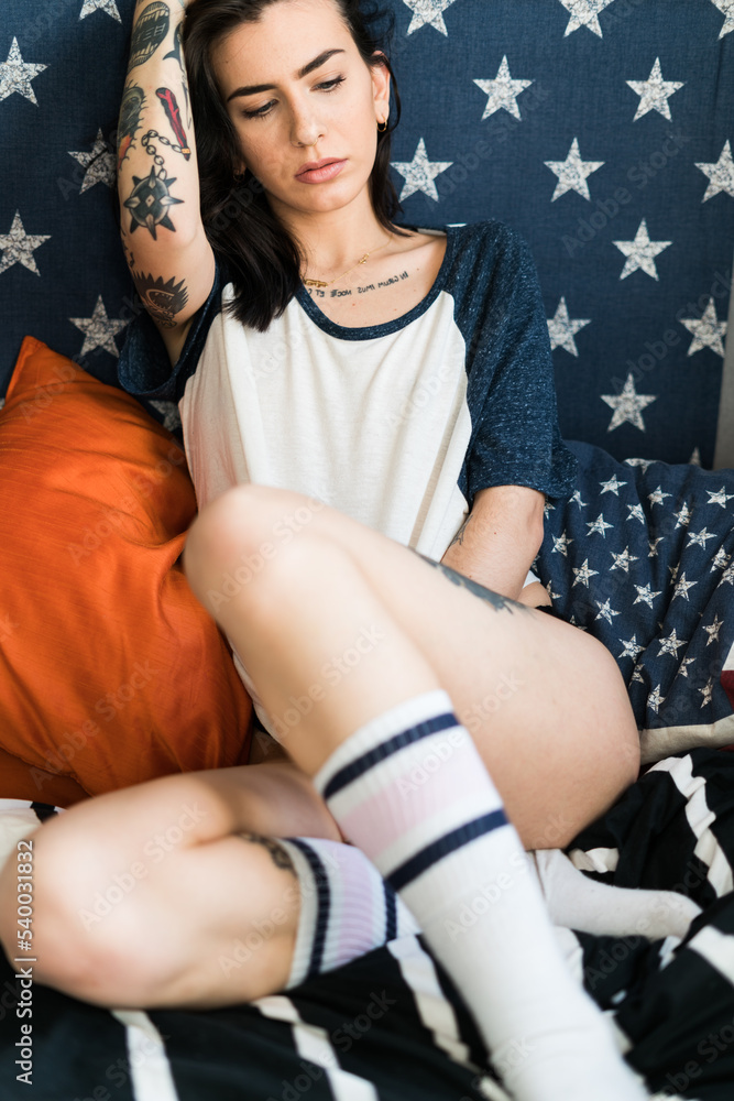 Young woman with tattoos sitting on a sofa with a united states flag on wall relaxing