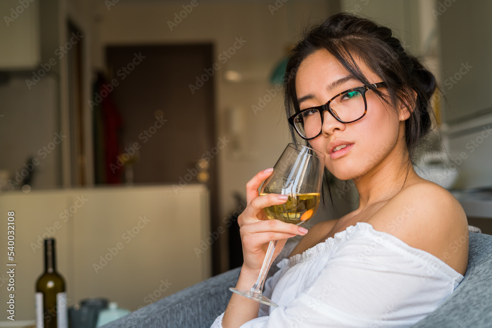 Interesting young chinese drinking wine and wearing glasses