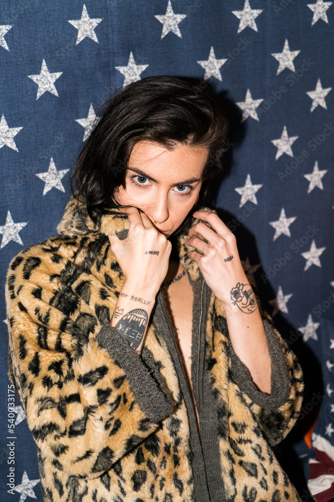 Adult woman wearing an animal print jacket indoors with a united states flag in the background.