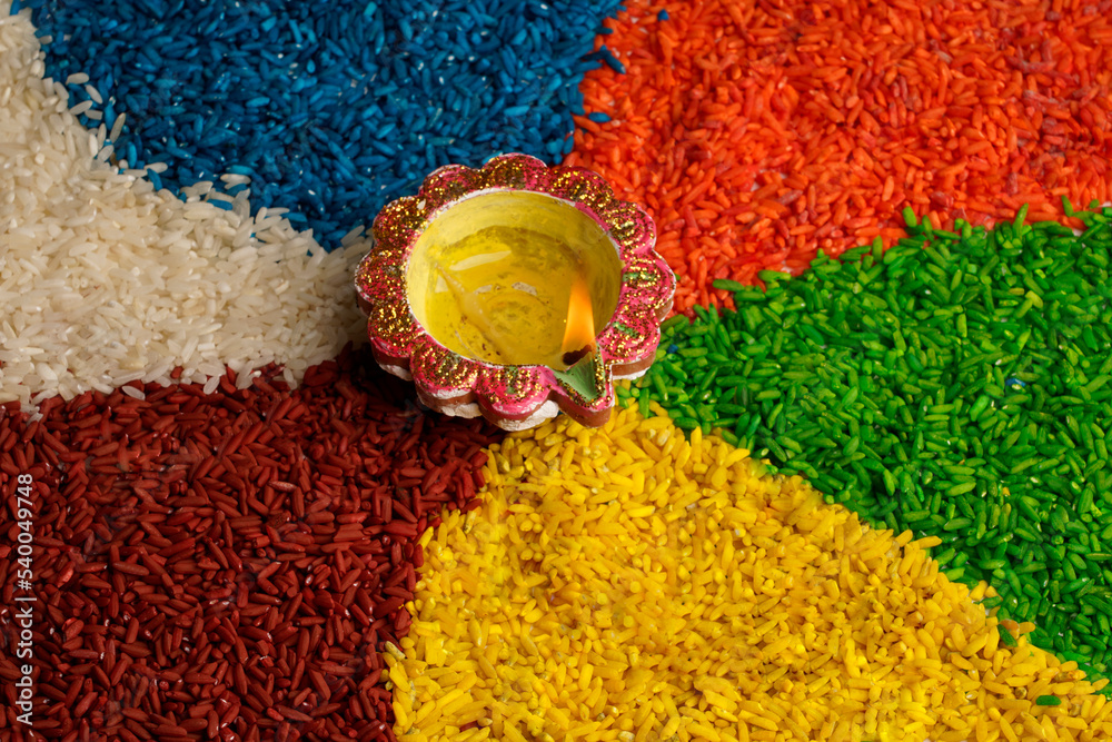 Oil lamps lit on colorful rangoli or rice during diwali celebration