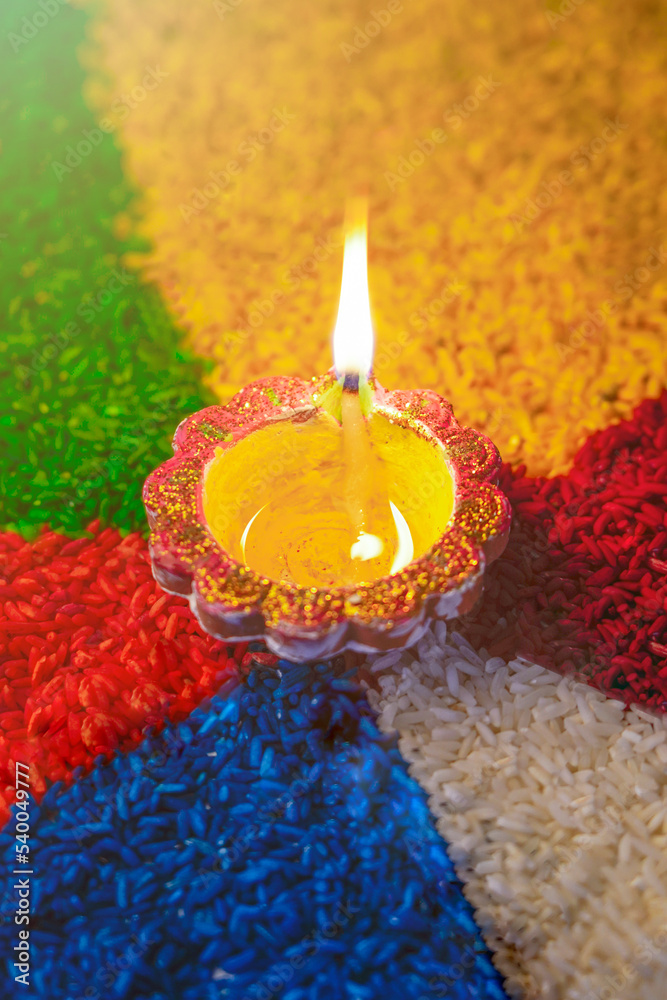 Oil lamps lit on colorful rangoli or rice during diwali celebration