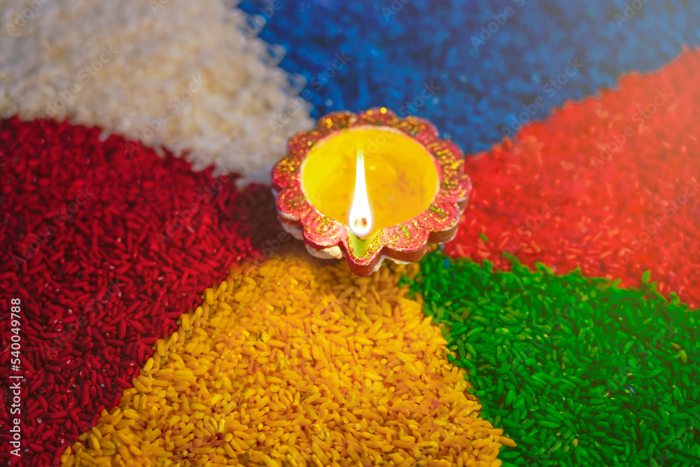 Oil lamps lit on colorful rangoli or rice during diwali celebration