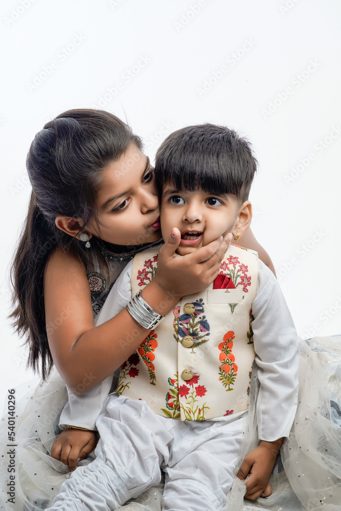 Cute little Indian asian siblings standing and embracing each other in white clothes ethnic standing against white background.