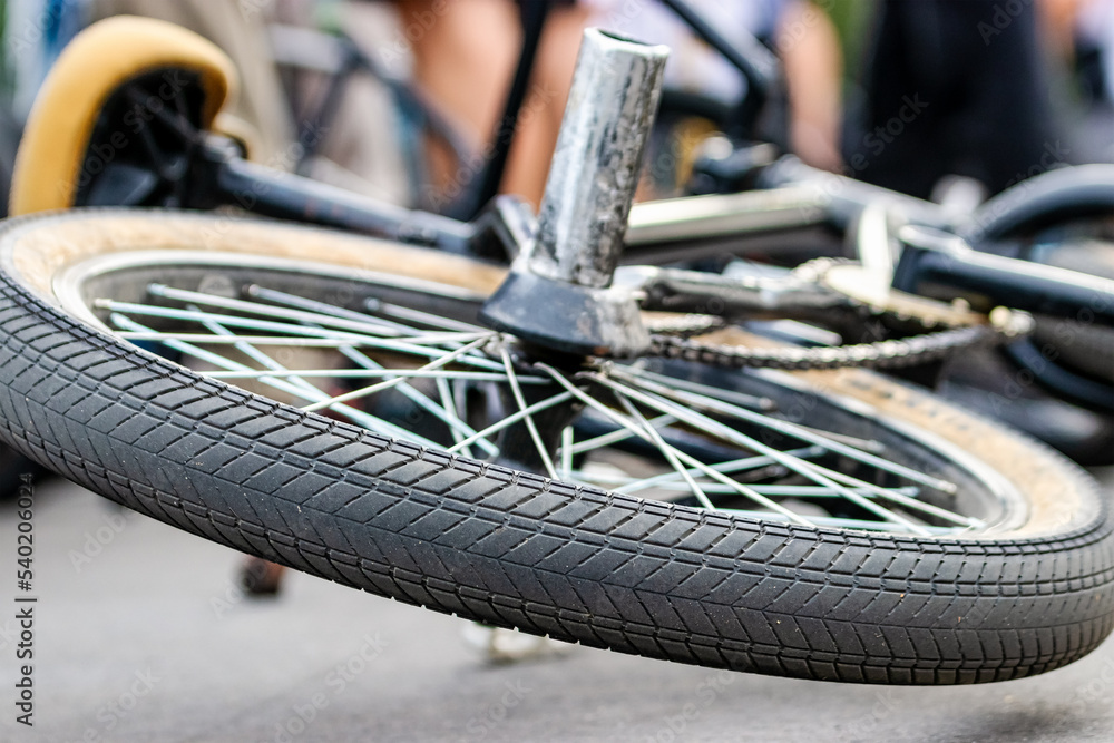 Bicycle for jumps and tricks BMX in the skatepark. Sports bike close up. Cycling.