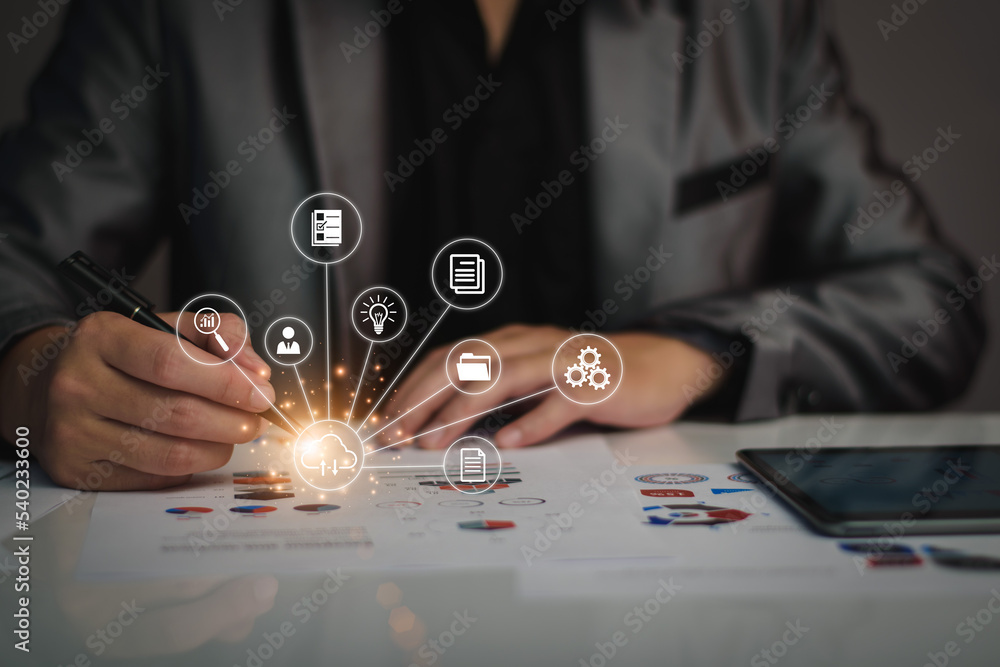 Businessman accessing the Cloud Computing Technology Internet Storage Network Concept And a large database big data Through internet technology. Digital business data, Future Data Network Management.