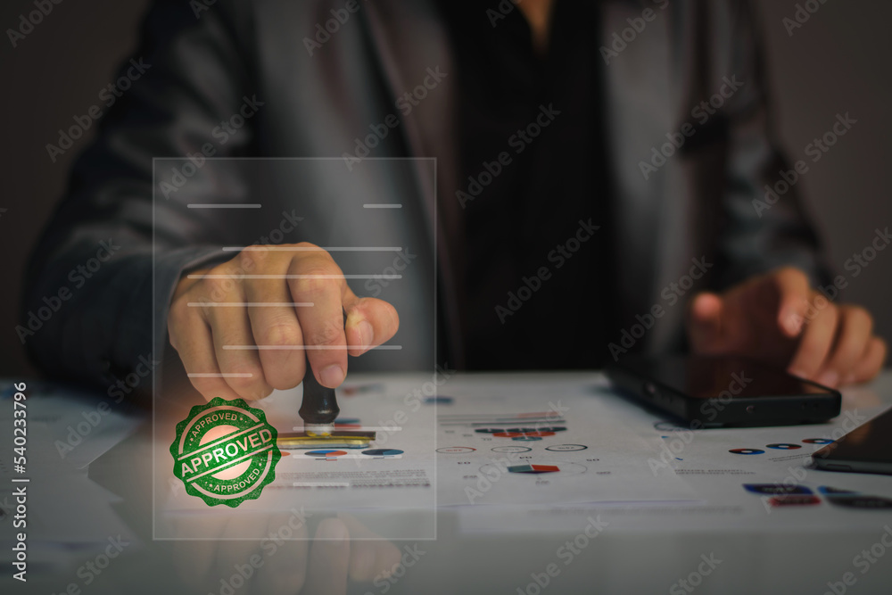 Business approved concept. Manager hand stamping with approved stamp on certificate document public paper, investment certificate, business document, certificate approved, investment allowed.