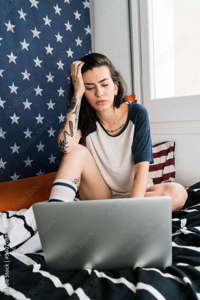 Adult woman using personal computer while sitting on bed with a united states print flag.