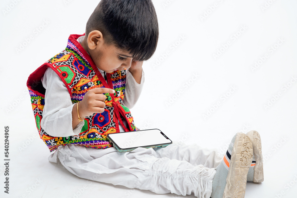 cute indian little kid in ethnic dress playing with phone or showing phone screen and expression on white background