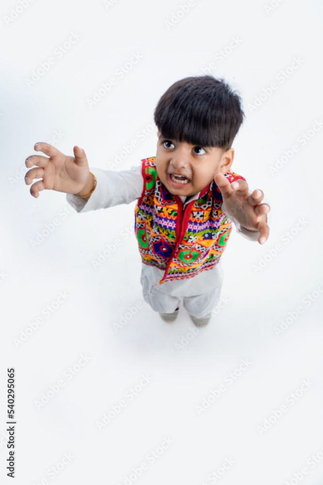 Cute indian little child in ethnic wear and showing stubborn expression over white background