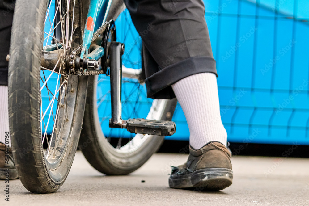 Bicycle for jumps and tricks BMX in the skatepark. Sports bike close up. Cycling.