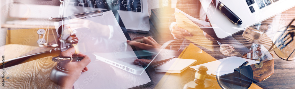 Business and lawyers discussing contract papers with brass scale on desk in office. Law, legal services, advice, justice and law concept picture with film grain effect