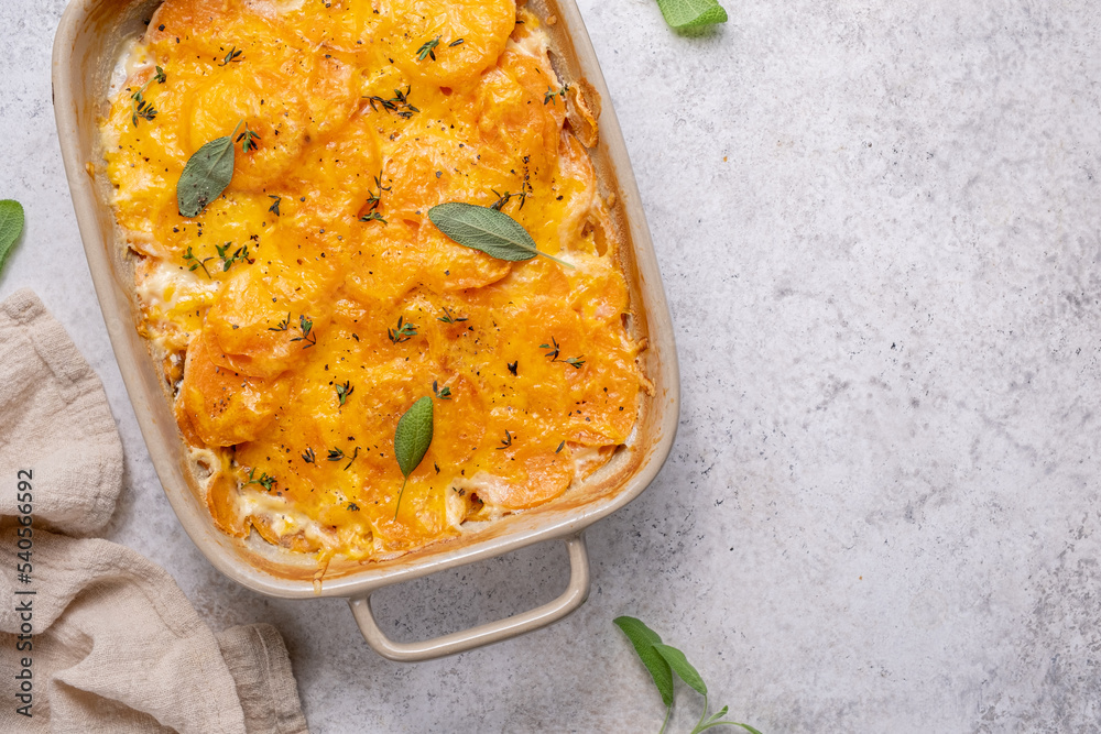 Savory Sweet potato gratin with cream and cheddar cheese in baking dish