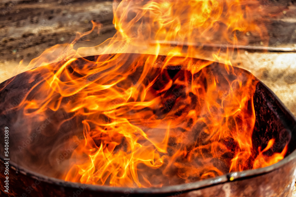 Burning fire in a barrel close-up. Bright flame. Open flame heating. Problems with heating and gas.