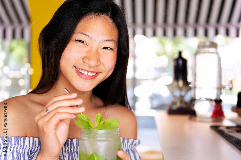 portrait of a young asian woman smiling happy drinking a refreshing soda in a cool trendy coffee shop, concept of beauty and youth