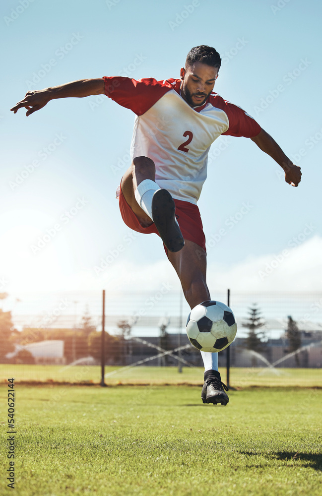 Man, soccer and ball tricks in sports, fitness and exercise for training, workout or practice on the field in the outdoors. Athletic active soccer player in football sport trick, motivation or cardio