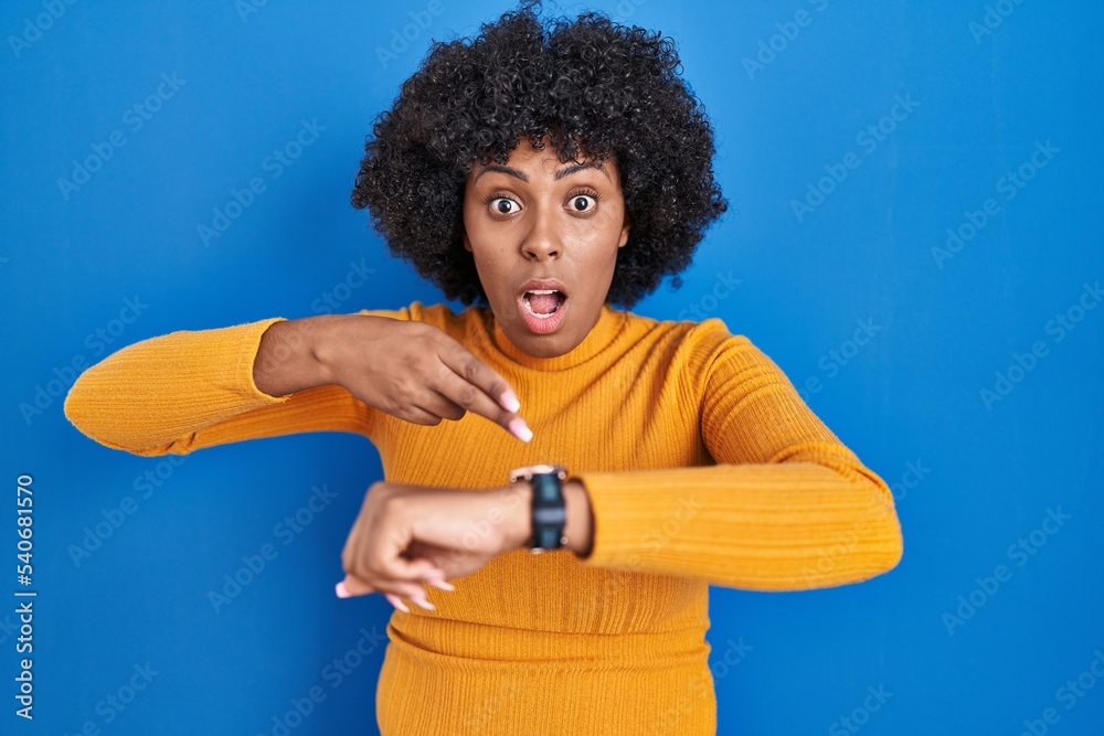 Black woman with curly hair standing over blue background in hurry pointing to watch time, impatience, upset and angry for deadline delay