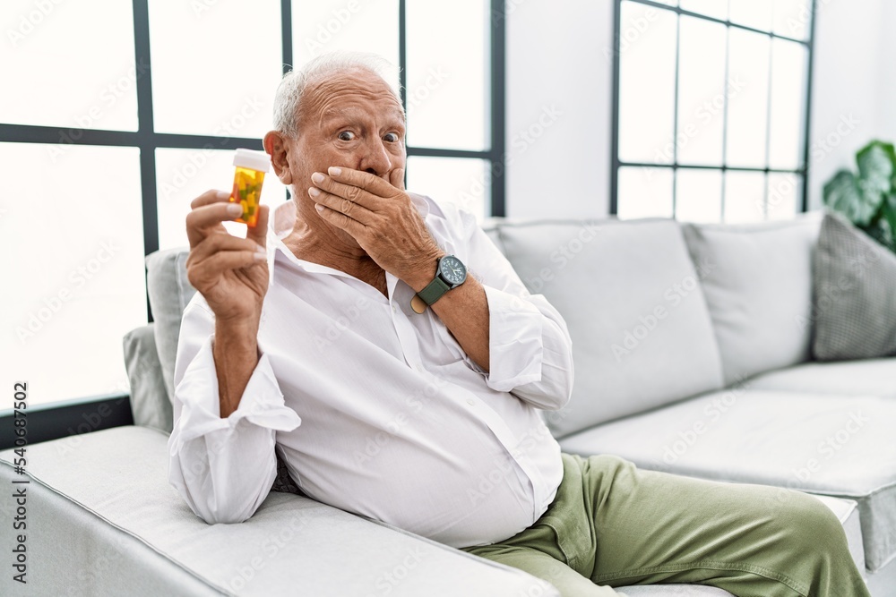 Senior man holding pills laughing and embarrassed giggle covering mouth with hands, gossip and scandal concept