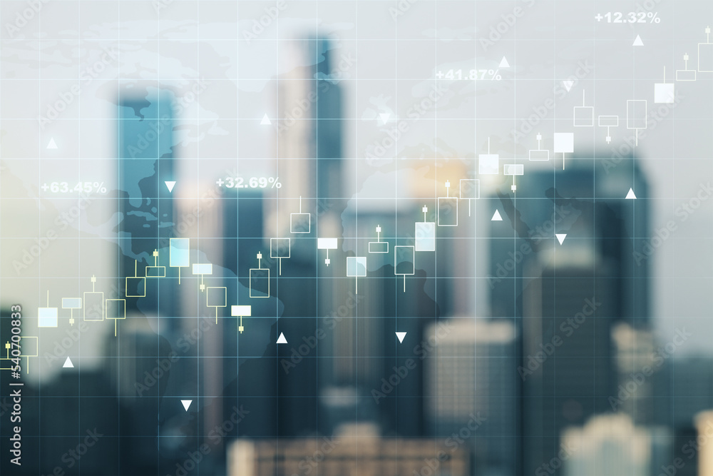 Multi exposure of virtual abstract financial graph hologram and world map on blurry skyscrapers background, financial and trading concept