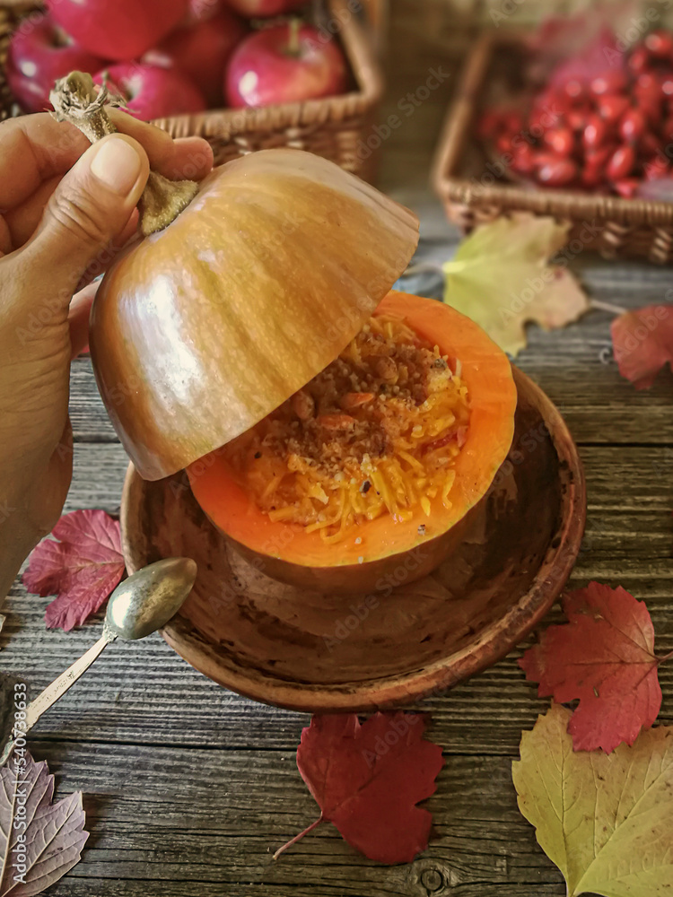 Vegan pumpkin porridge pudding sweet dessert healthy organic food on vintage table background