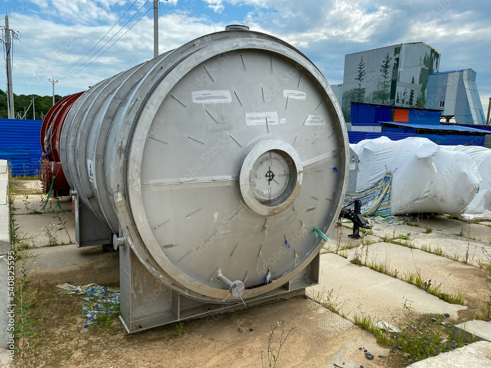 Large shiny stainless steel shell and tube heat exchanger for heating liquids and gases, ready to be installed for oil refinery petrochemical plant equipment on the construction site