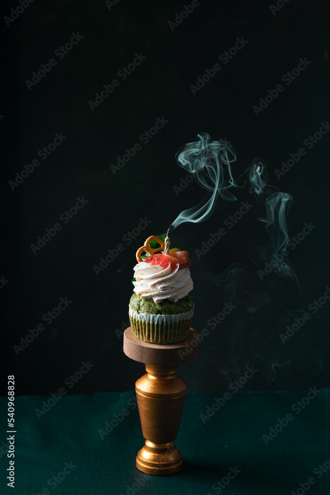 tasty birthday salted cupcake with an extinguished candle on dark background . Vertical