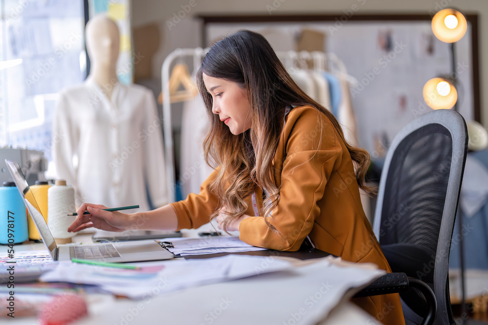 Young professional clothes fashion designer sitting near sewing machine use laptop computer and tablet pc to reference and draw the design on the paper pattern